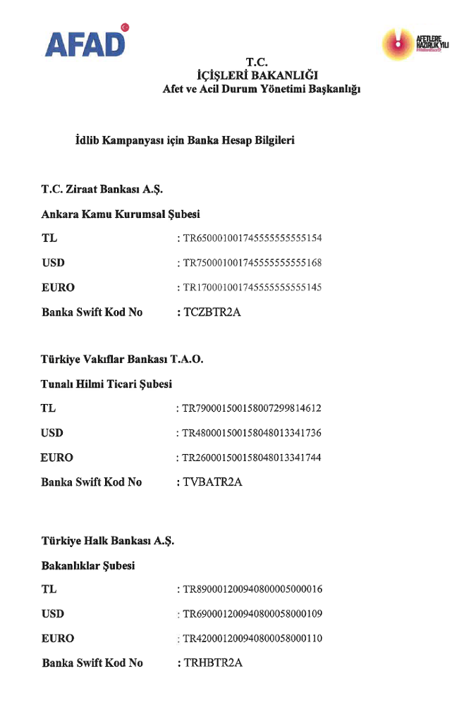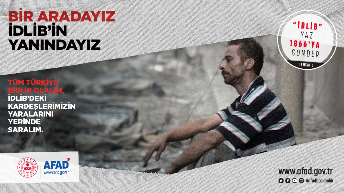 AFAD Başkanlığıtarafından Türkiye Kızılay Derneği ve Türkiye Diyanet Vakfı’nın yanısıra çeşitli sivil toplum kuruluşlarıyla işbirliği içinde İdlib’e yönelik “Bir aradayız, İdlib’in yanındayız” temalı insani yardım kampanyası başlatılmıştır.