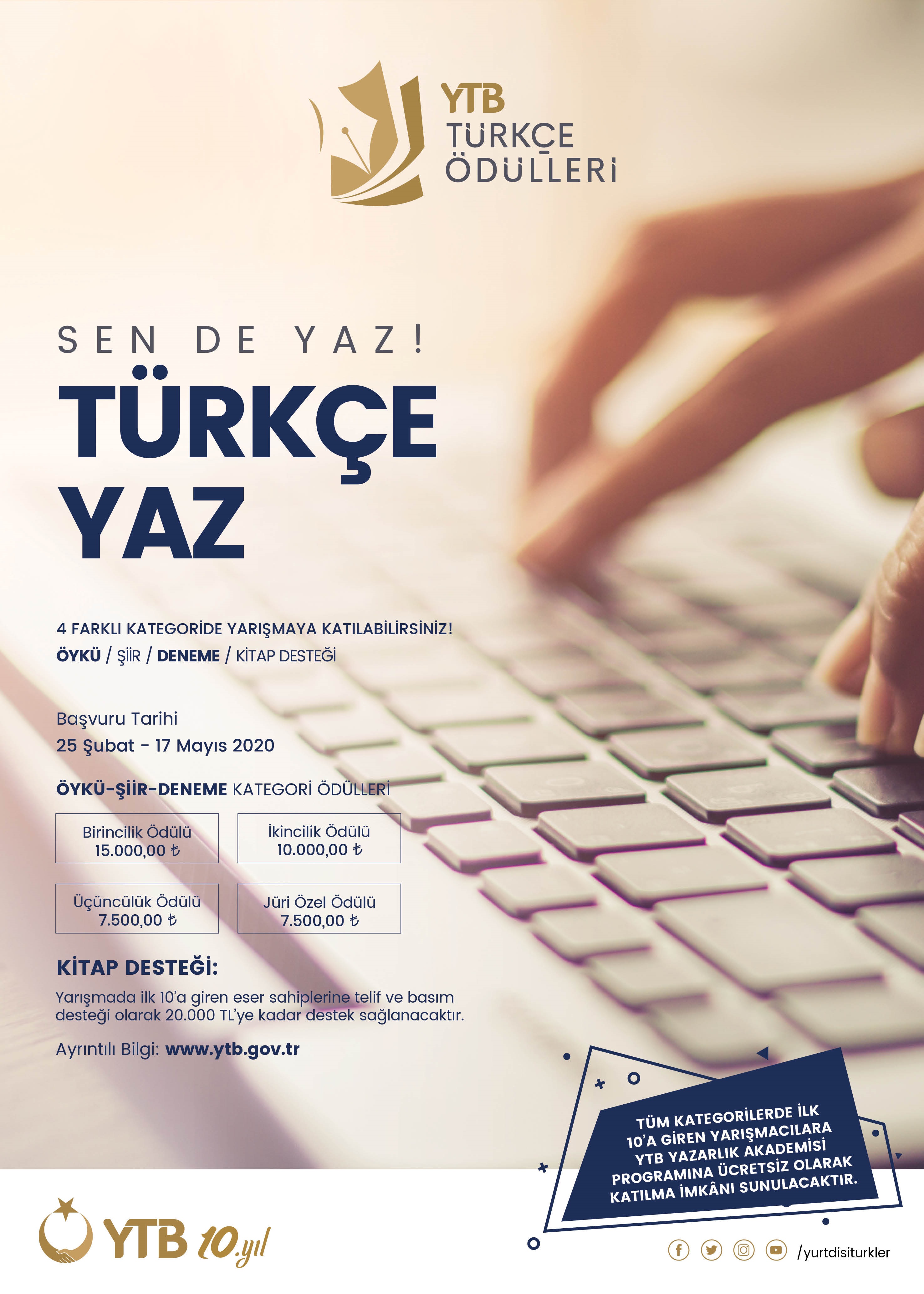 Yurtdışı Türkler ve Akraba Topluluklar Başkanlığı (YTB) tarafından yurt dışında yaşayan vatandaşlarımızın anadil konusundaki yetkinliklerini ve ifade kabiliyetlerini artırmak, kendi kültürel birikimlerini ortaya çıkarmak, Türk diasporası edebiyatı alanına yeni açılımlar kazandırmak ve yurt dışında yaşayan Türkler tarafından kaleme alınan Türkçe edebi eserlerin çeşitlenmesini teşvik etmek amacıyla "YTB Türkçe Ödülleri" adı altında bir ödül programı geliştirildiği, programın öykü, şiir, deneme ve kitap desteği olmak üzere 4 ayrı kategoride gerçekleştirileceği ve her kategori için ayrı seçici kurul oluşturulacağı, tüm kategorilerde derece elde eden katılımcılara çeşitli ödüller takdim edileceği, programla ilgili detaylı bilgiye "https://www.ytb.gov.tr/guncel/2020-ytb-turkce-odulleri-yarismasi" adresinden ulaşılabileceği ilişkin detaylı bilgiye "www.ytb.gov.tr/diasporagenclikakademisi/" adresinden ulaşılabilecektir.