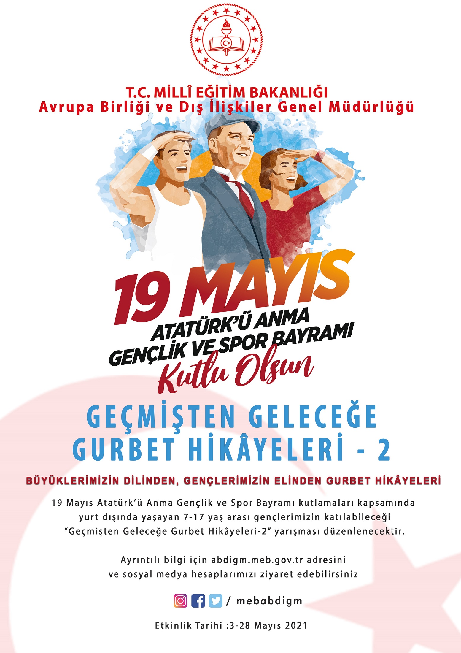 Türkiye’nin Milli Mücadelesi’nin başlangıcının 102’inci yıldönümü ve 19 Mayıs Atatürk’ü Anma Gençlik ve Spor Bayramı kutlamaları vesilesiyle, Milli Eğitim Bakanlığımız tarafından yurtdışında yaşayan 7-17 yaş arası çocuklarımızın katılabileceği “Geçmişten Geleceğe Gurbet Hikâyeleri 2” temalı bir yarışma düzenleneceği bildirilmiştir. Sözkonusu yarışma için başvuru formu ve şartname ekte sunulmaktadır.